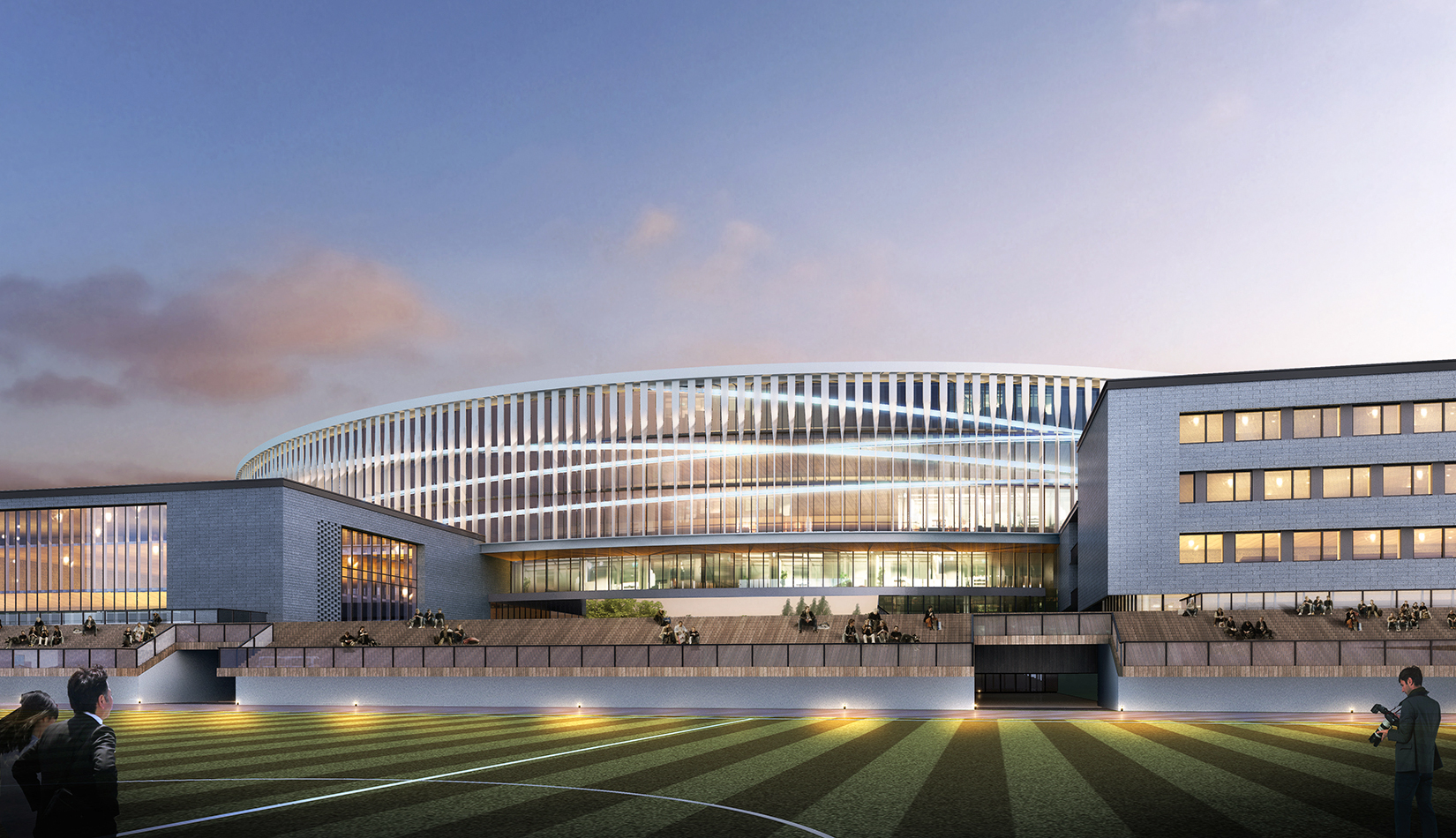 建筑方形體量運(yùn)用魯班鎖的本質(zhì)——榫卯結(jié)構(gòu),進(jìn)行體塊塑造,將這種天人合一的工匠精神貫穿整個(gè)校園。立面材質(zhì)上,采用石材及具有中國(guó)古典韻味的磚幕墻,體現(xiàn)學(xué)校厚重的文化底蘊(yùn)?!棒敯嗑€”交織在教學(xué)綜合體所在的圓形體塊上,利用動(dòng)感流線型的線條,使建筑更具有藝術(shù)氣息。