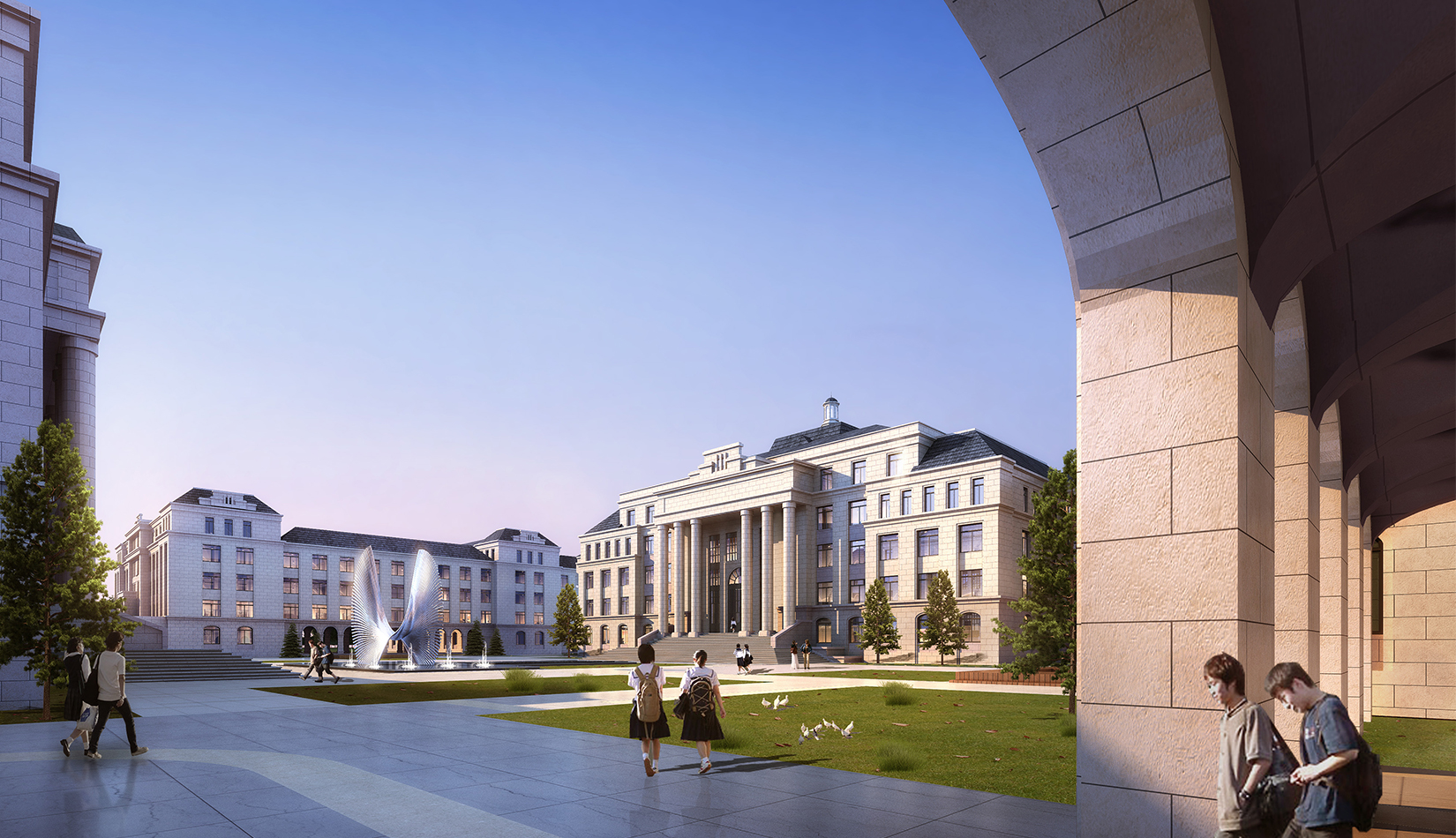 景觀設(shè)計引用了《禮記聘義》中對玉的六大特征:“禮”“知” “樂” “信”“義”“仁”作為景觀主題植入學(xué)校各個重要空間。