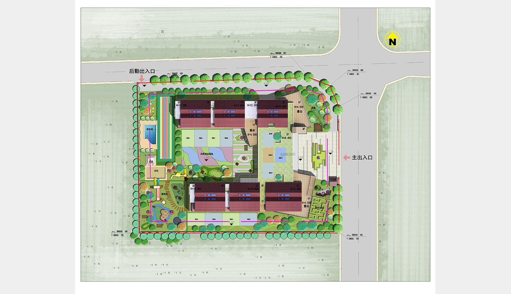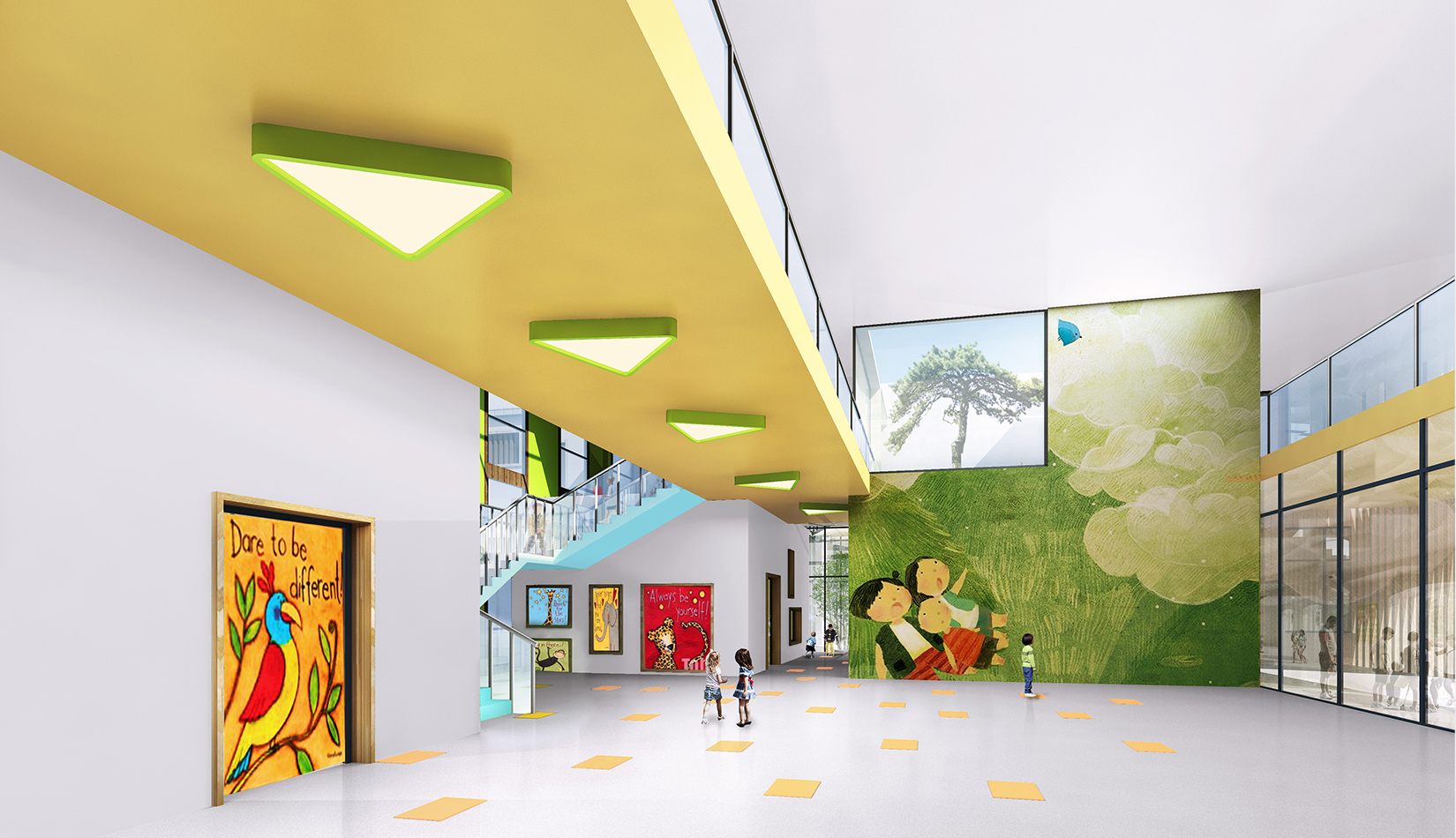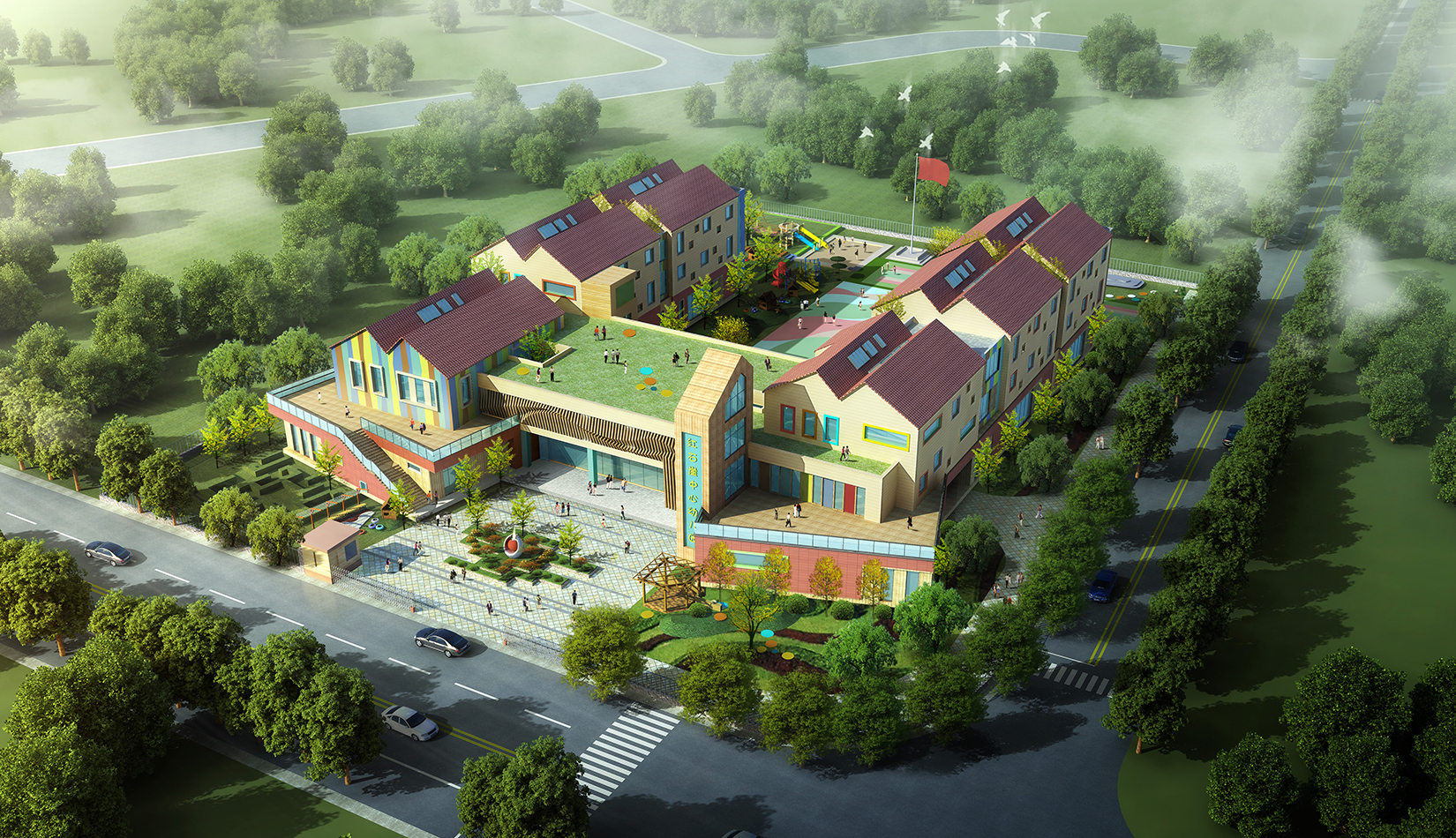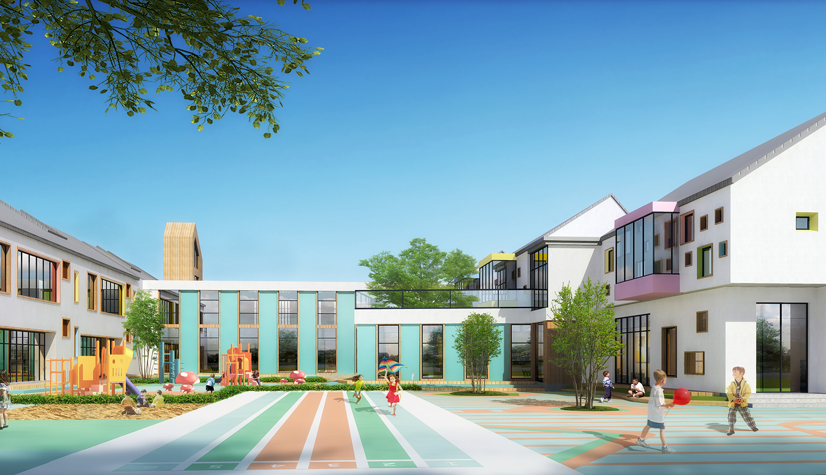 建筑造型來(lái)源于兒童最初對(duì)房子的印象并進(jìn)行延伸,加上積木搭接形態(tài),形成C字形圍合的主體建筑,就像父母溫暖的懷抱;建筑造型跟兒童產(chǎn)生很好的親切感,讓兒童將上幼兒園成為快樂的事情。同時(shí)形態(tài)結(jié)合地緣文化特色,采用雙折坡屋頂,寓意展翅翱翔的海鷗。