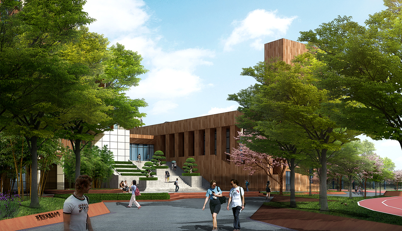 1. 將抽象化的鳳翎設(shè)計(jì)成特色種植,結(jié)合建筑形態(tài)配以流線型鋪裝設(shè)計(jì),在鋪裝上增加鳳凰島中學(xué)校訓(xùn)校風(fēng)的細(xì)節(jié)設(shè)計(jì),凸顯學(xué)校濃郁的文化氛圍以及室外景觀環(huán)境的精致。