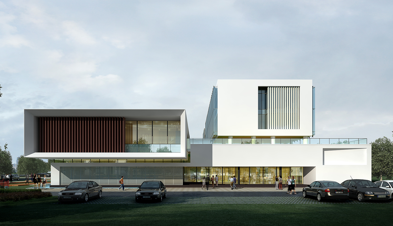 作為中韓貿易合作區(qū)一期啟動區(qū)的重點項目,其承擔著對外展示以及為后續(xù)發(fā)展提供服務平臺的功能。因此設計力求穩(wěn)重大氣,以4 層的體量打造出地標性的建筑。設計運用簡潔的外形、寧靜的色彩,外立面以白色涂料和木格柵為主,尊重自然,打造一種平和寧靜的感覺。在空間設計上通過共享空間、上人露臺和一層大平臺,創(chuàng)造出舒適宜人的工作環(huán)境;在技術上通過地源熱泵、呼吸式幕墻、雨水收集等的應用,實現建筑的綠色節(jié)能環(huán)保。