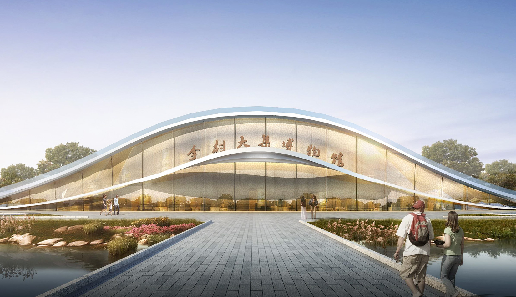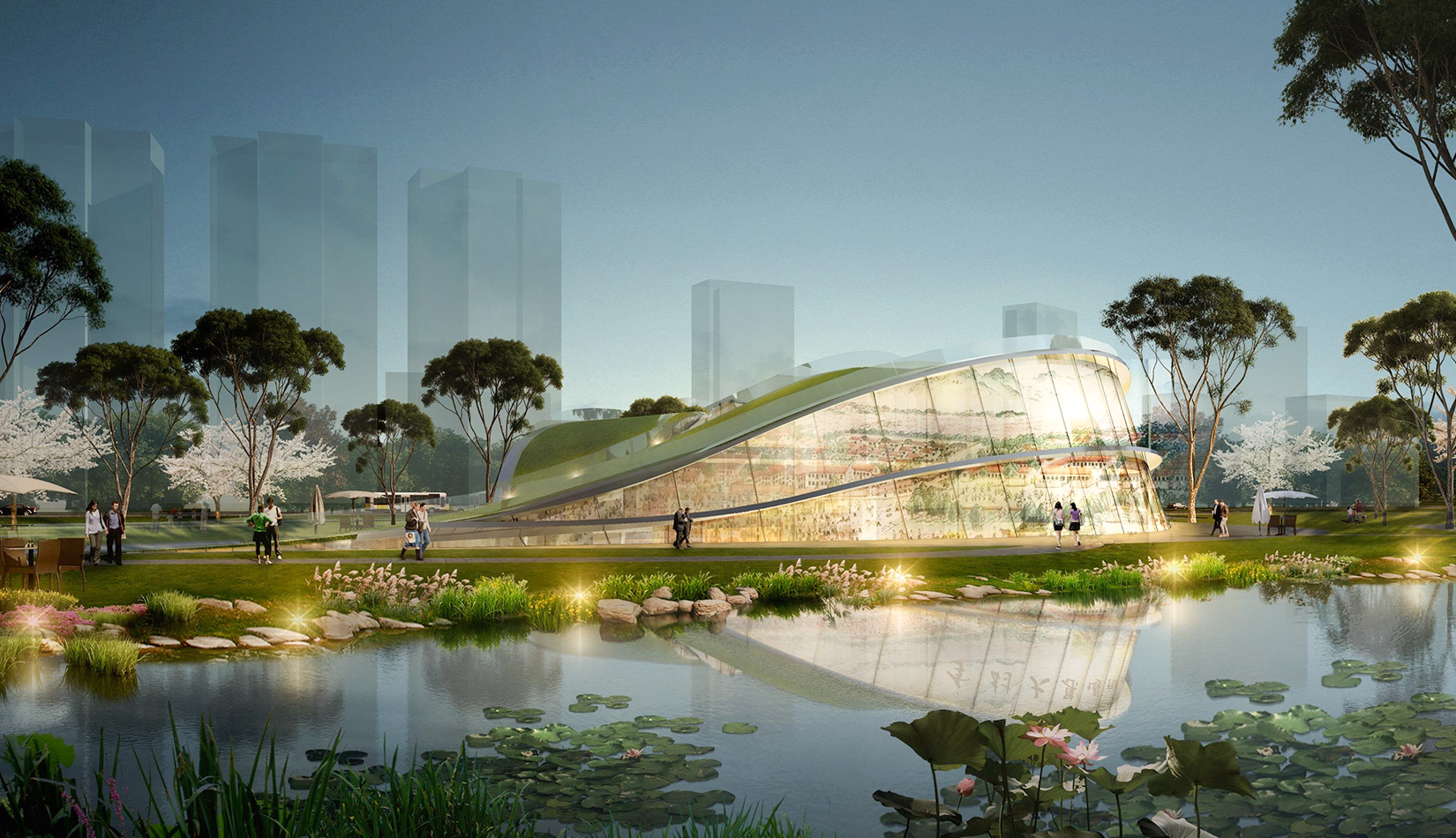 該項(xiàng)目基地位于濱河公園內(nèi),目標(biāo)要將博物館打造成一個(gè)生態(tài)建筑,建筑能與環(huán)境有機(jī)融合。在這一理念下,將博物館設(shè)計(jì)為樹葉形,建筑猶如一片樹葉飄落在公園內(nèi),以此體現(xiàn)建筑與環(huán)境的融合。將樹葉形建筑設(shè)計(jì)為覆土建筑,最大程度還原基地一片綠色,以此呼應(yīng)李村大集的“還原”內(nèi)涵。通過設(shè)計(jì)兩個(gè)曲線形體相互交融形成建筑的最終體量,以此體現(xiàn)相逢意蘊(yùn),呼應(yīng)李村大集的“相逢”內(nèi)涵。